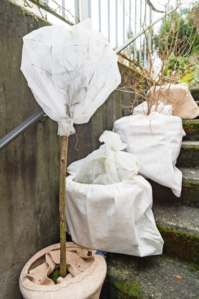 Rośliny należy owinąć agrowłókniną od samej podstawy aż do wierzchołka. Całość warto owinąć sznurkiem, aby uniknąć zsuwania się włókniny. Można też spiąć jej brzegi zszywkami. Włóknina powinna miękko otulać rośliny, nie krępując zarazem jej pędów.