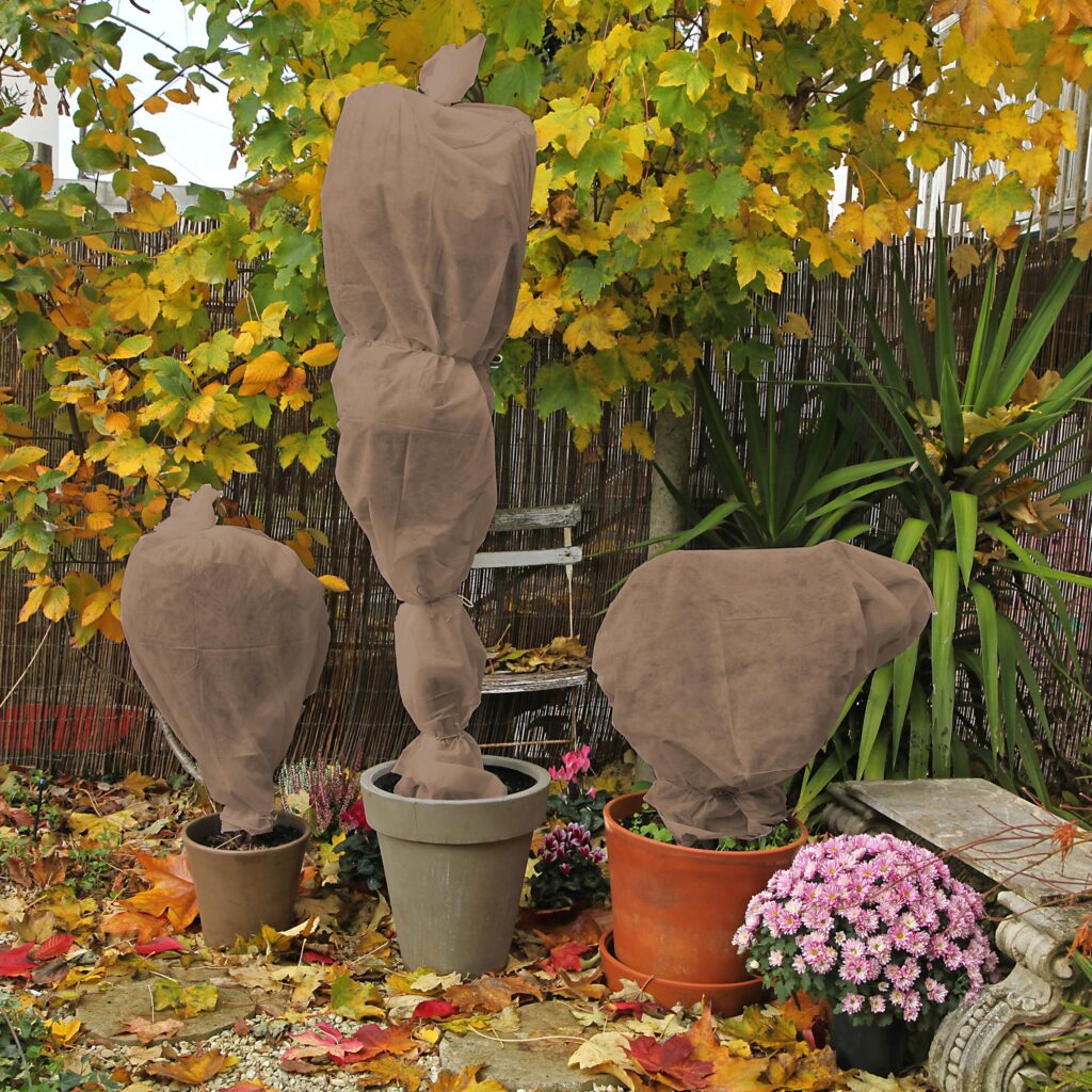 Do roślin wrażliwych najbardziej polecanym materiałem jest agrowłóknina. Najlepiej sprawdza się jeśli jest wykonana z polipropylenu o gramaturze od 20 do 50 g/m2. Może ona ochronić rośliny nie tylko przed ujemnymi temperaturami, ale też groźnym często w sezonie jesienno-zimowym, wysuszającym wiatrem. Jej odpowiednio dobrana gramatura zapewnia ochronę nawet w bezśnieżne i bardzo mroźne zimy – przepuszcza wodę i nawozy płynne. Na rynku dostępne są włókniny w różnych kolorach, sprzedawane w metrach bieżących. Możemy wybrać, czy najbardziej w naszym ogrodzie sprawdzi się włóknina czarna, biała czy brązowa, przy czym najbardziej polecaną jest biała, która rozprasza światło i umożliwia krążenie powietrza. Wyjątek stanowią formowane bukszpany i różaneczniki, do których warto dobrać ciemniejszą tkaninę – na przykład brązową lub czarną, która przepuszcza mniej światła.