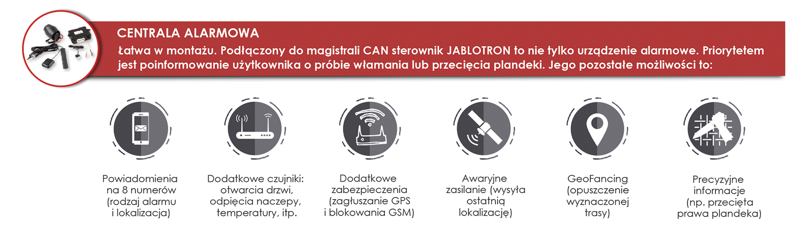 D: Oczywiście, nowa generacja autoalarmu GSM/GPS ma możliwość montażu na magistrali CAN. Za pomocą autoalarmu możemy monitorować nie tylko stan plandek, ale i otwarcie drzwi naczepy, co jest bardzo istotne dla bezpieczeństwa ładunku. System oferuje pełen monitoring, a także funkcję Geofance, która wysyła informację o opuszczeniu określonej strefy (co może sugerować kradzież) i o innych wyjazdach za pomocą SMS. Kolejną sprawą jest całkowicie darmowa (bez żadnych abonamentów) aplikacja MyJABLOTRON, dzięki której możliwe jest m.in. korzystanie z aktualnego rejestru kierowców z możliwością ich identyfikacji. Umożliwia to również rozpoznawanie pojazdów bezpośrednio na mapie i wyświetlanie informacji o aktualnym miejscu każdego z pojazdów na trasie.